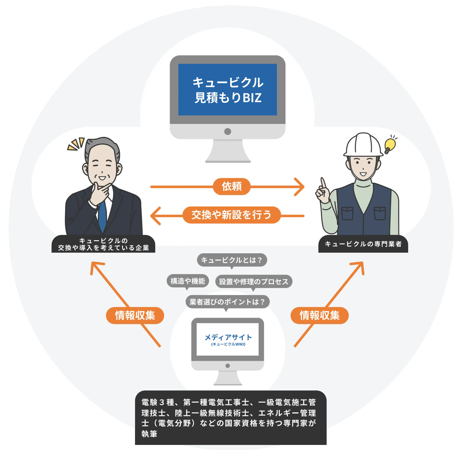 技術と専門知識を活かし、企業がより安全で効率的なキュービクルの導入や整備ができる場を提供します。マッチングプラットフォームとメディアサイトを通じて、技術的な相談からオーダーメイドによる設計、施工や導入などのプロセスをサポートし、互いに最適な条件で提携できるよう支援します。
